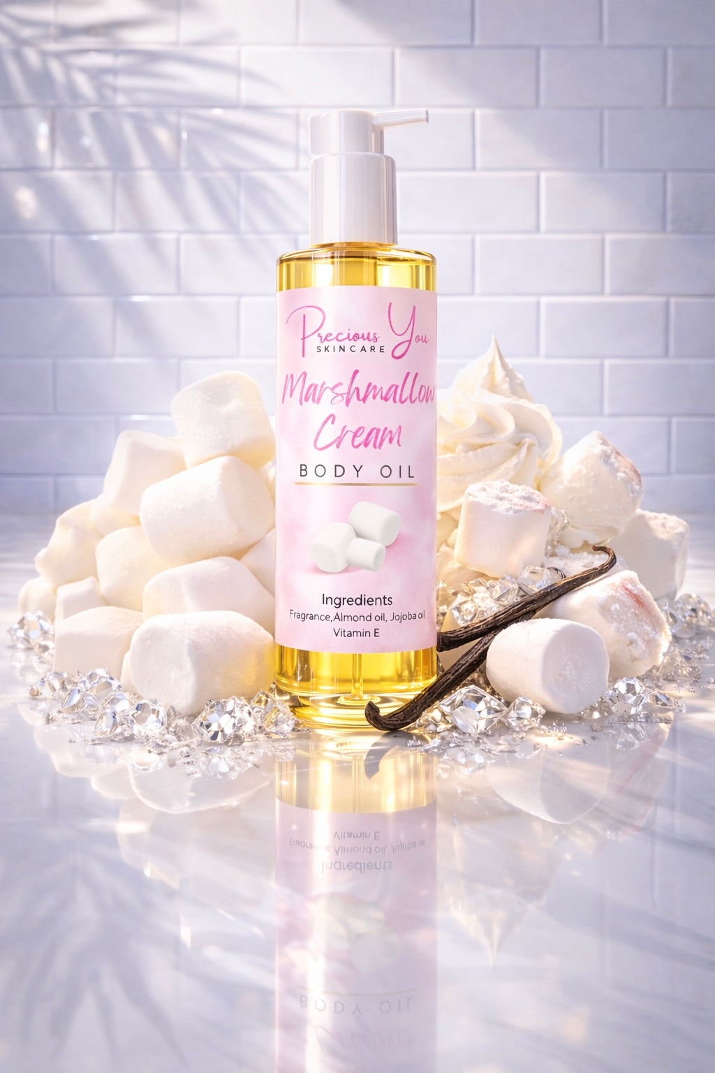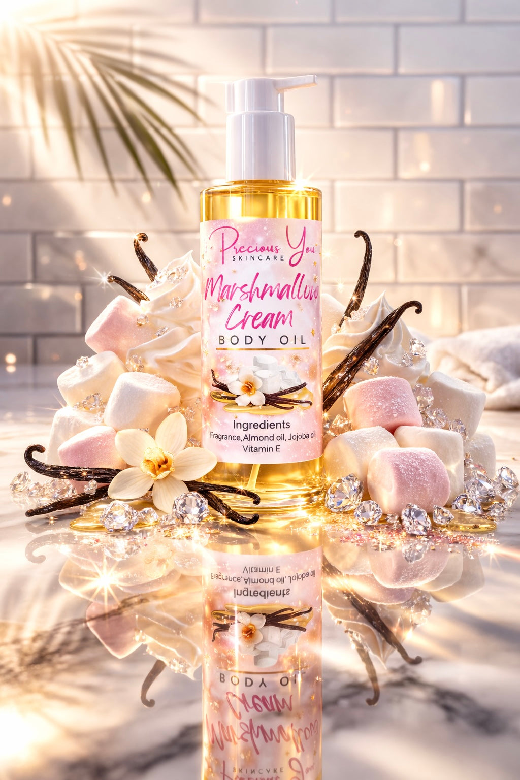 Marshmallow Cream body oil combines the light texture of whipped marshmallow with the nourishing properties of vanilla, raw sugar cane, and heavy cream. This formulation enhances skin hydration, supporting moisture retention and delivering a soft, smooth appearance. Ideal for daily use, it promotes overall skin health.